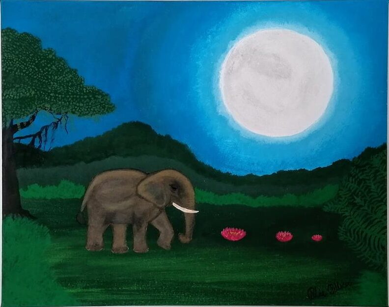 Mystische Dschungelszene unter Vollmond: Ein Elefant und eine Lotusblume symbolisieren Stärke, Weisheit und Reinheit.Luz de selva 🖼️ Acrylgemälde von Pilar Pellecer